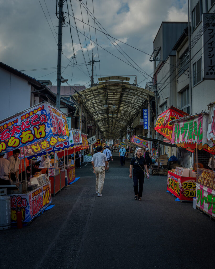 お祭り会場の商店街には、たくさんの屋台が並び、活気にあふれていました。たくさんの提灯が灯り、人々が踊る様子は、まるで映画のワンシーンのよう。遠くから街全体の雰囲気を捉えるのも、素敵な思い出になります。