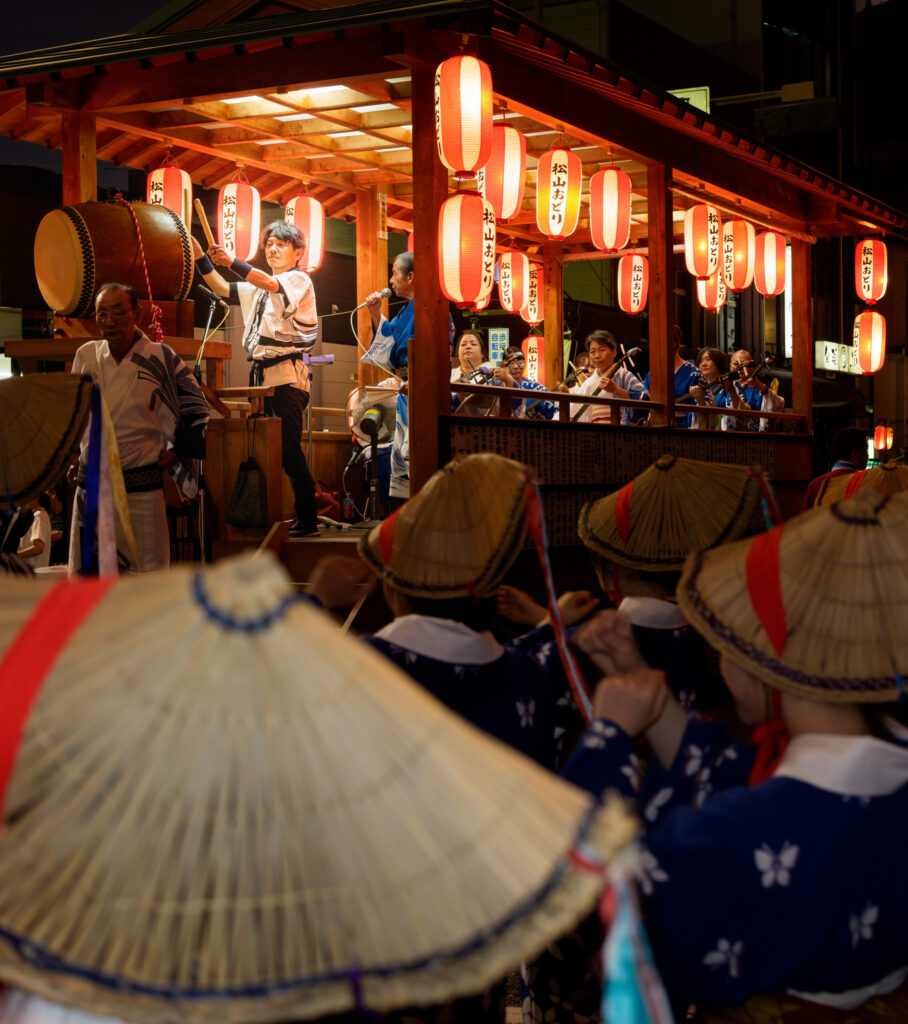 祭りの中心には、お囃子を奏でる曳山があります。提灯の温かい光に照らされた曳山は、お祭りムード満点で最高の被写体です。踊り連と一緒に曳山をフレームに収めたり、太鼓を叩く人たちにフォーカスしたり、様々な構図で楽しめます。